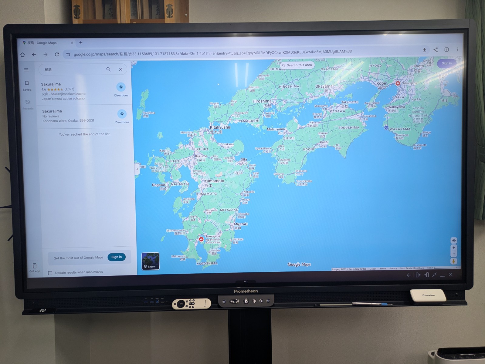 まずはGoogleマップで「桜島」と検索します。マイクを搭載した電子黒板であれば、音声入力を使うと入力の手間が省け、授業のテンポもスムーズになります。検索結果が表示されれば、桜島がどこにあるかは一目瞭然です。