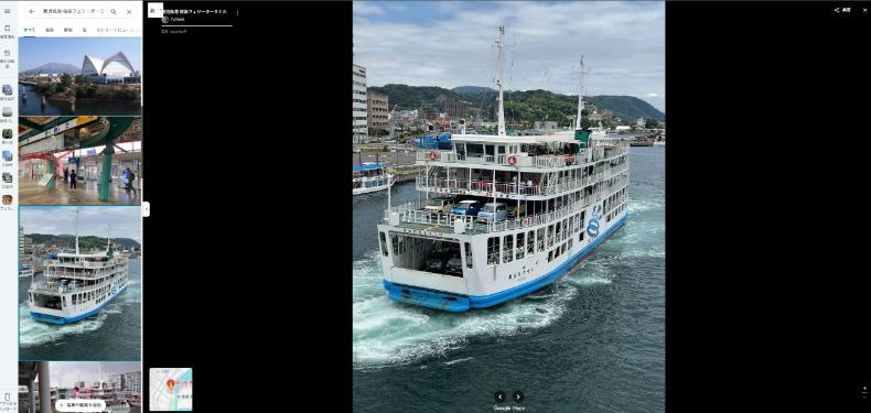 さらに詳しく見ていくと、左側の薩摩半島との間に「青い点線」があることに気づきます。そこで「鹿児島港 桜島フェリーターミナル」をクリックしてみます。すると、フェリーが運航していることだけでなく、投稿されている写真から「車を載せて移動できる」という事実まで、セットで理解することができます。