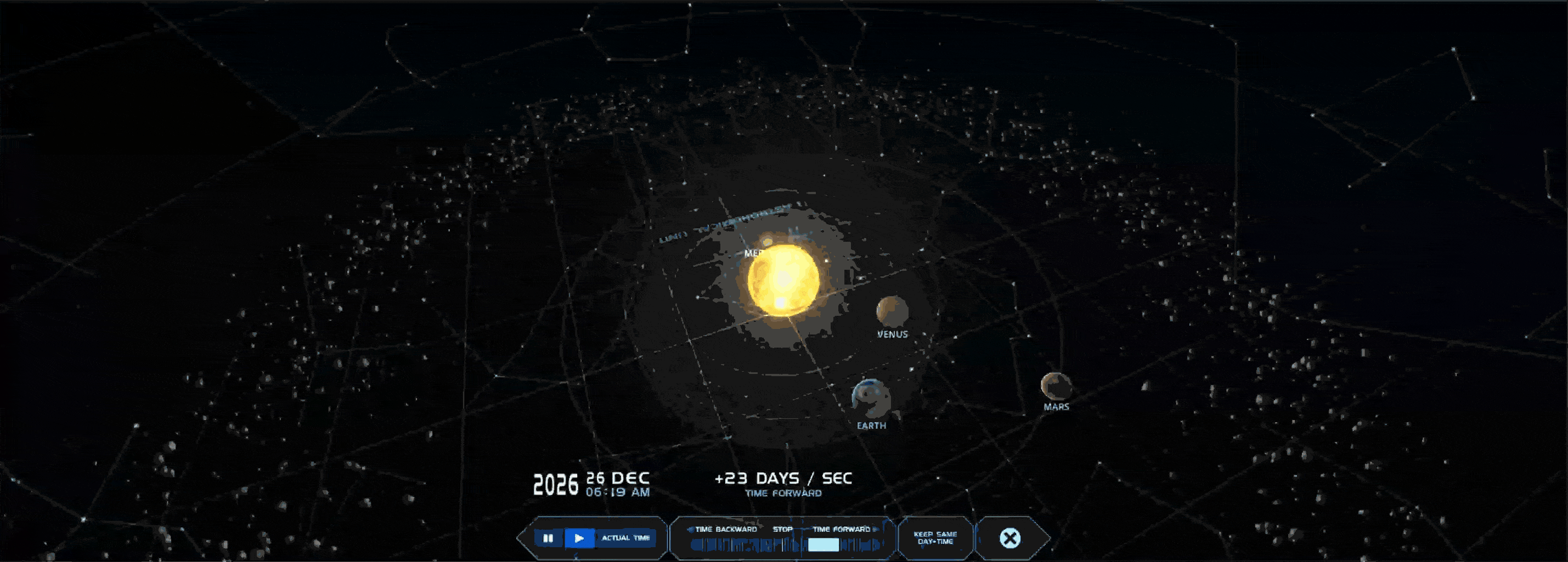 日付を変えれば、紀元前の夜空も2000年後の夜空も表示できます。天体の動きが地球規模・時間規模であることを、直感的に理解させるための道具として機能します。