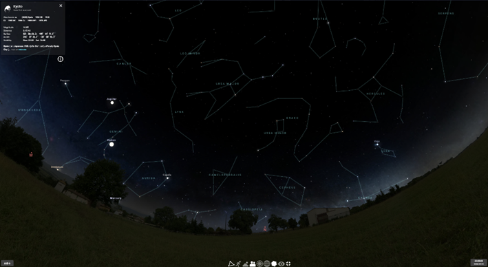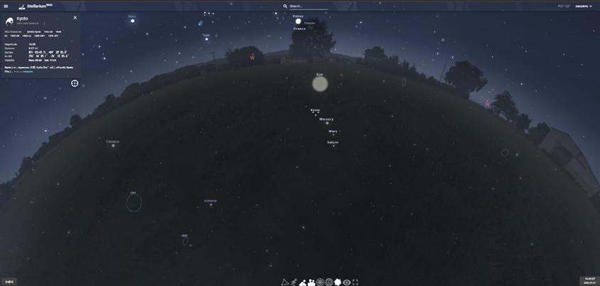Stellariumを起動し、観測地点を京都に設定。