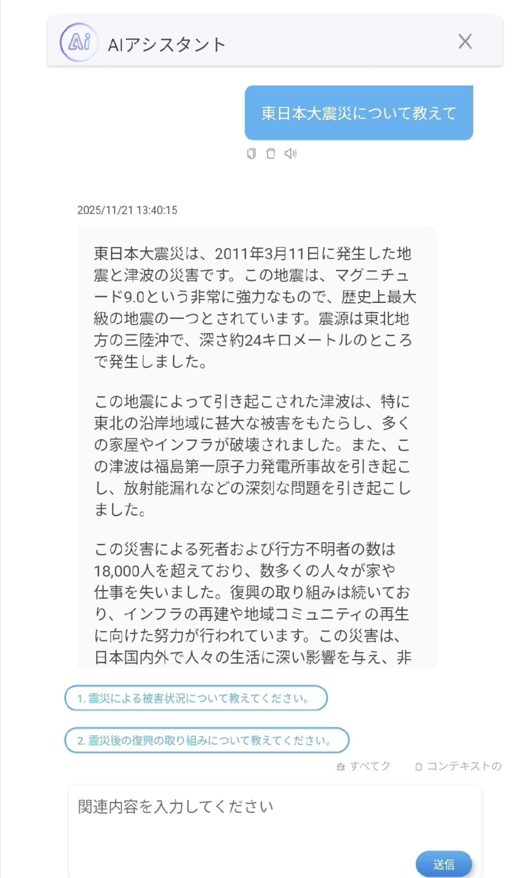 ホワイトボードアプリのAIアシスタントの応答画像。口頭で「東日本大震災について教えて」と尋ねると、画像のように詳細に返答。